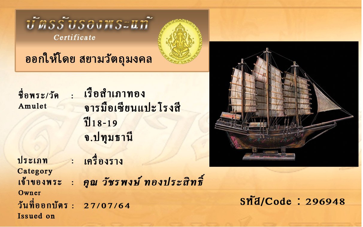 รหัสสินค้า : 296948 เรือสำเภาทอง จารมือเซียนแปะโรงสี ปี18-19 จ.ปทุมธานี