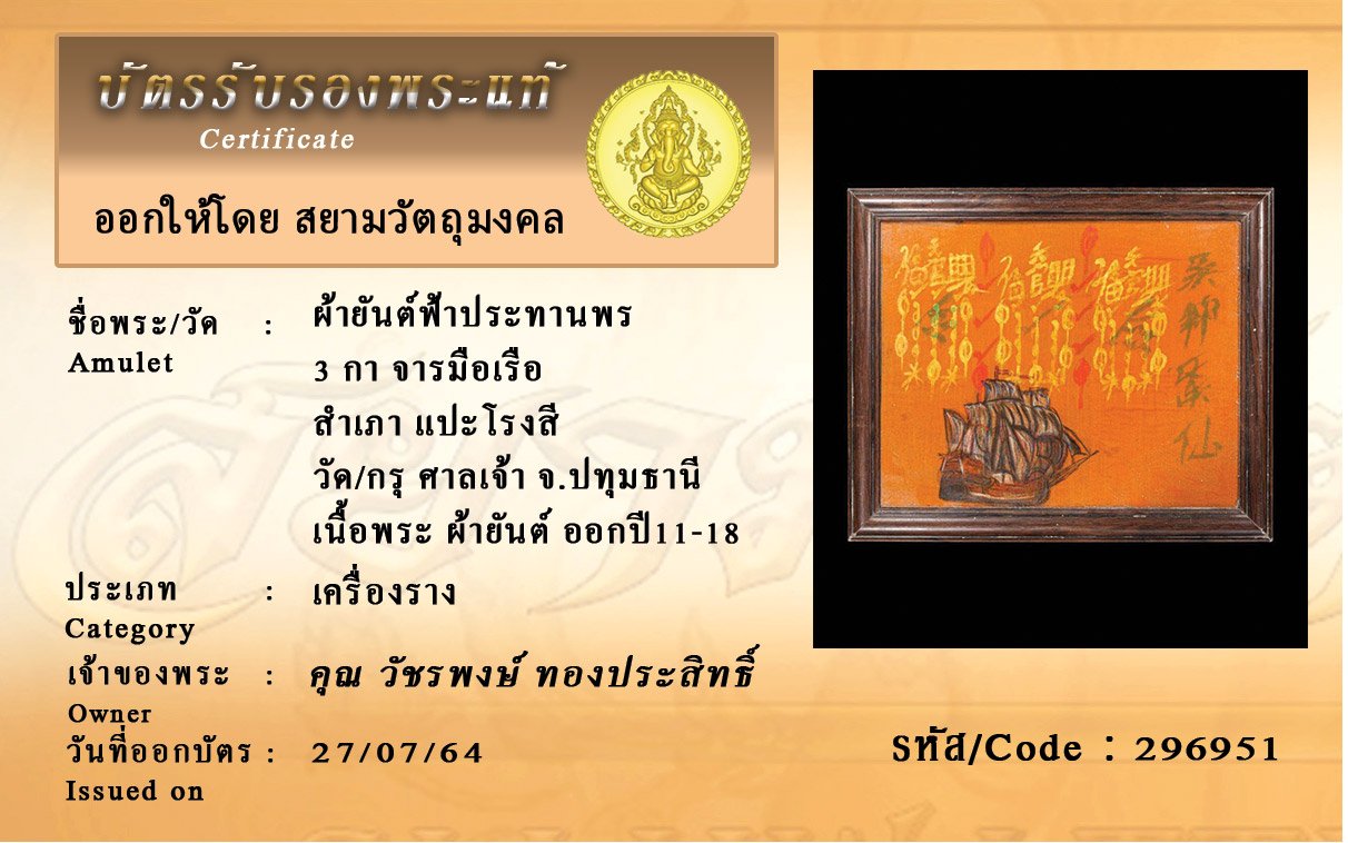 รหัสสินค้า : 296951 ผ้ายันต์ฟ้าประทานพร 3 กา จารมือเรือ สำเภา แปะโรงสี วัด/กรุ ศาลเจ้า จ.ปทุมธานี เนื้อพระ ผ้ายันต์ ออกปี11-18