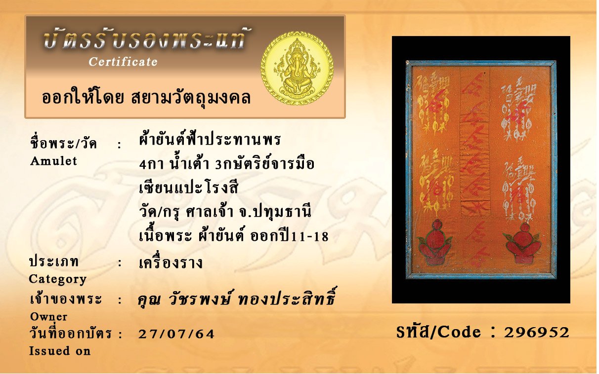 รหัสสินค้า : 296952 ผ้ายันต์ฟ้าประทานพร 4กา น้ำเต้า 3กษัตริย์จารมือ แปะโรงสี วัด/กรุ ศาลเจ้า จ.ปทุมธานี เนื้อพระ ผ้ายันต์ ออกปี11-18