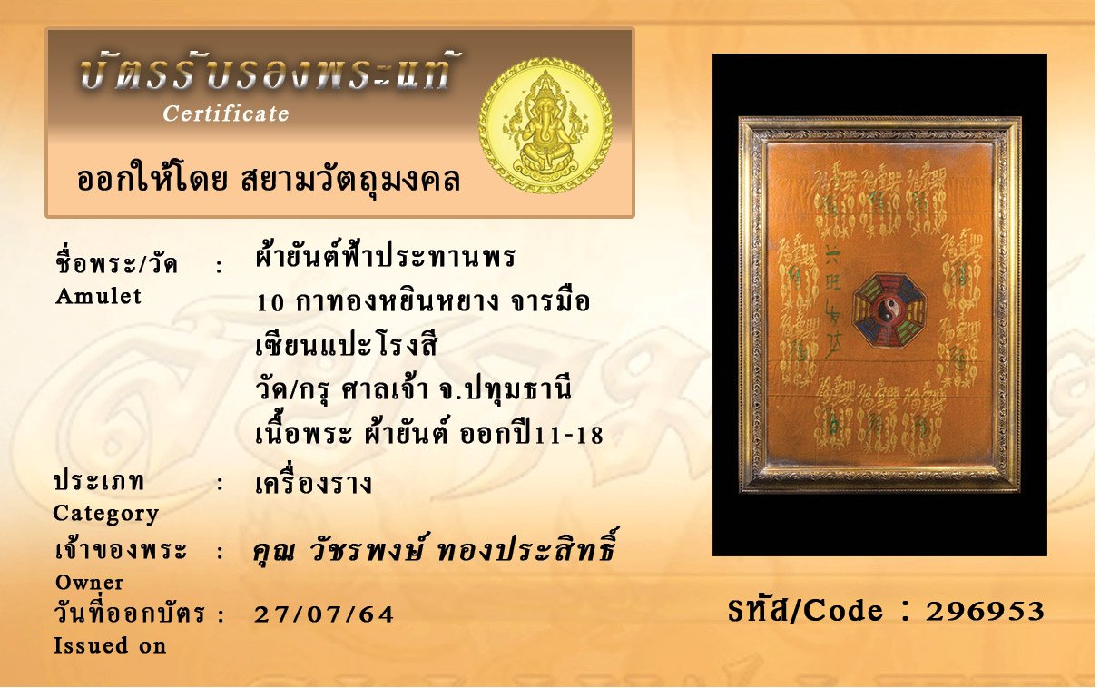 รหัสสินค้า : 296953 ผ้ายันต์ฟ้าประทานพร 10กาทอง หยินหยาง จารมือ แปะโรงสี วัด/กรุ ศาลเจ้า จ.ปทุมธานี เนื้อพระ ผ้ายันต์ ออกปี11-18