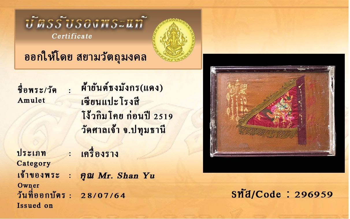 รหัสสินค้า : 296959 ผ้ายันต์ธงมังกร(แดง) เซียนแปะโรงสี โง้วกิมโคย ก่อนปี 2519 วัดศาลเจ้า จ.ปทุมธานี