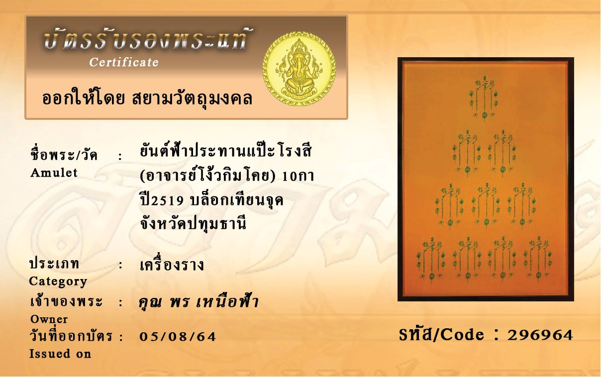 รหัสสินค้า : 296964 ยันต์ฟ้าประทานแป๊ะโรงสี (อาจารย์โง้วกิมโคย) 10กา ปี2519 บล็อกเทียนจุด จังหวัดปทุมธานี