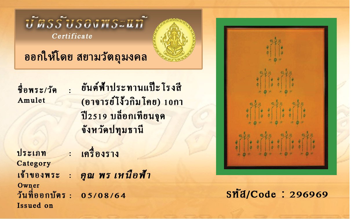 รหัสสินค้า : 296969 ยันต์ฟ้าประทานแป๊ะโรงสี (อาจารย์โง้วกิมโคย) 10กา ปี2519 บล็อกเทียนจุด จังหวัดปทุมธานี