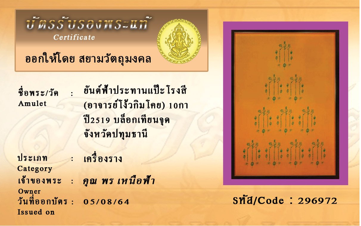 รหัสสินค้า : 296972 ยันต์ฟ้าประทานแป๊ะโรงสี (อาจารย์โง้วกิมโคย) 10กา ปี2519 บล็อกเทียนจุด จังหวัดปทุมธานี