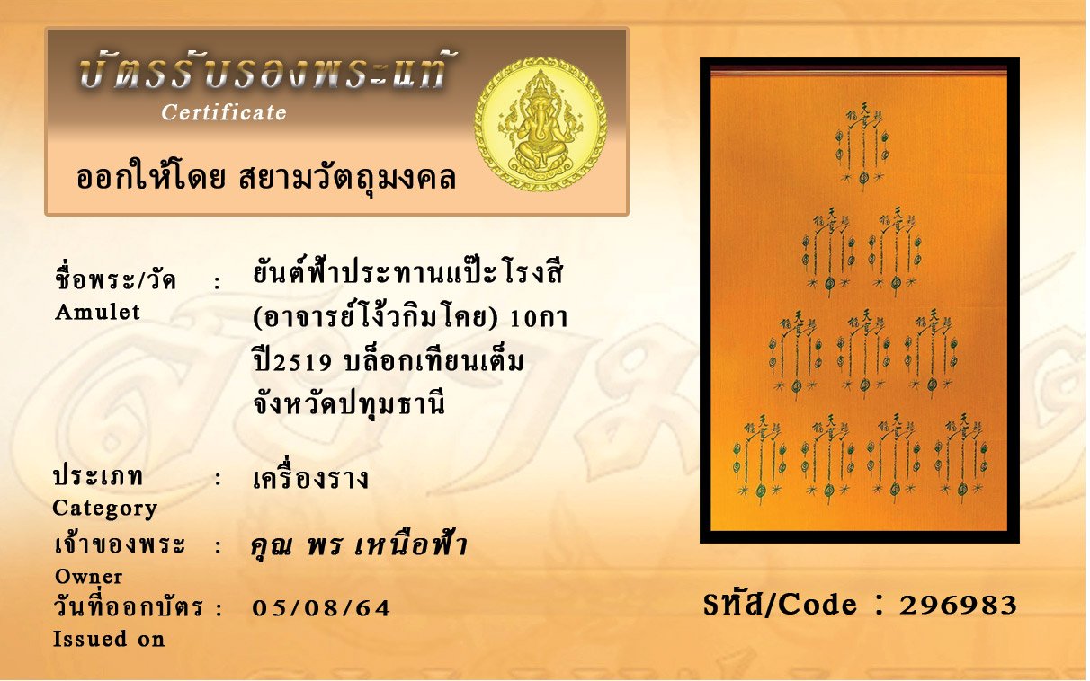 รหัสสินค้า : 296983 ยันต์ฟ้าประทานแป๊ะโรงสี (อาจารย์โง้วกิมโคย) 10กา ปี2519 บล็อกเทียนเต็ม จังหวัดปทุมธานี
