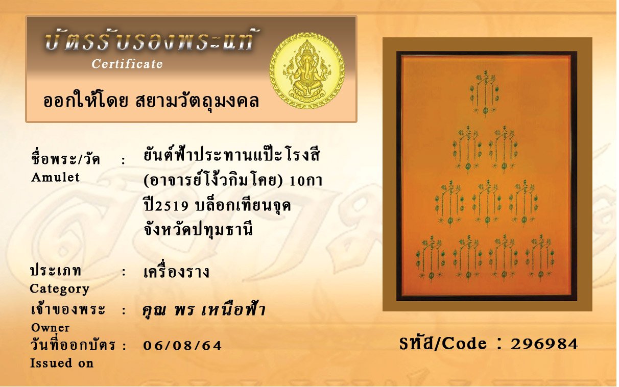 รหัสสินค้า : 296984 ยันต์ฟ้าประทานแป๊ะโรงสี (อาจารย์โง้วกิมโคย) 10กา ปี2519 บล็อกเทียนจุด จังหวัดปทุมธานี