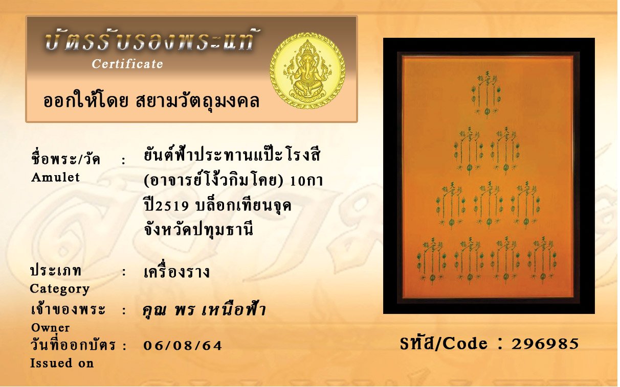 รหัสสินค้า : 296985 ยันต์ฟ้าประทานแป๊ะโรงสี (อาจารย์โง้วกิมโคย) 10กา ปี2519 บล็อกเทียนจุด จังหวัดปทุมธานี