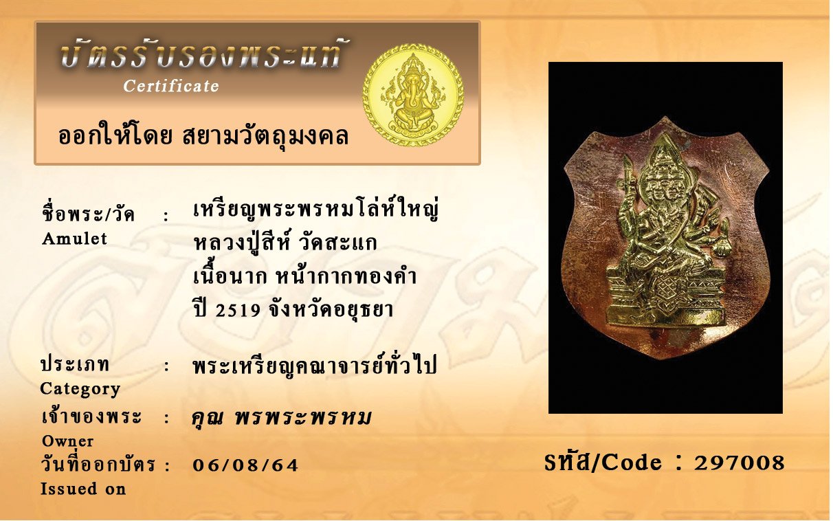รหัสสินค้า : 297008 เหรียญพระพรหมโล่ห์ใหญ่ หลวงปู่สีห์ วัดสะแก เนื้อนาก หน้ากากทองคำ ปี 2519 จังหวัดอยุธยา