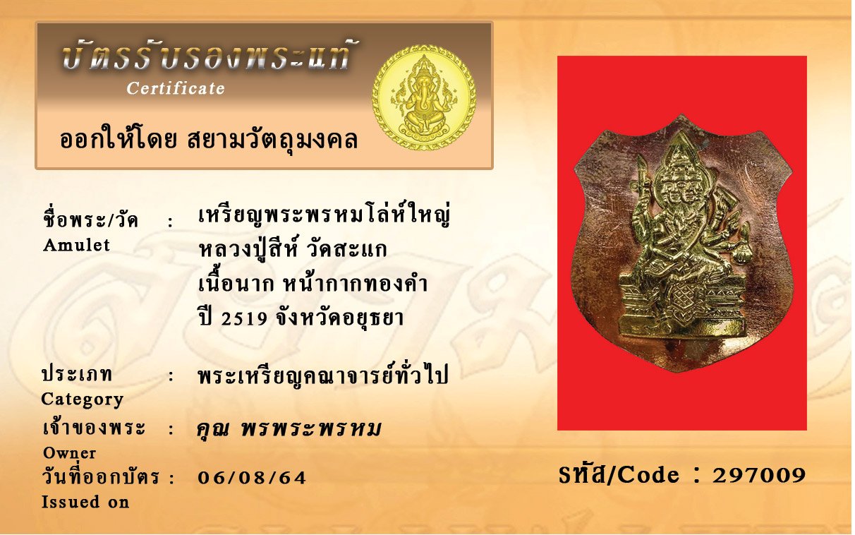 รหัสสินค้า : 297009 เหรียญพระพรหมโล่ห์ใหญ่ หลวงปู่สีห์ วัดสะแก เนื้อนาก หน้ากากทองคำ ปี 2519 จังหวัดอยุธยา
