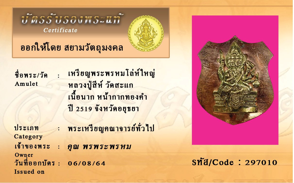รหัสสินค้า : 297010 เหรียญพระพรหมโล่ห์ใหญ่ หลวงปู่สีห์ วัดสะแก เนื้อนาก หน้ากากทองคำ ปี 2519 จังหวัดอยุธยา