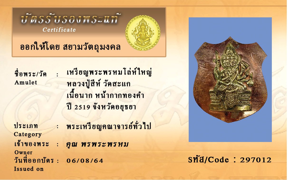 รหัสสินค้า : 297012 เหรียญพระพรหมโล่ห์ใหญ่ หลวงปู่สีห์ วัดสะแก เนื้อนาก หน้ากากทองคำ ปี 2519 จังหวัดอยุธยา