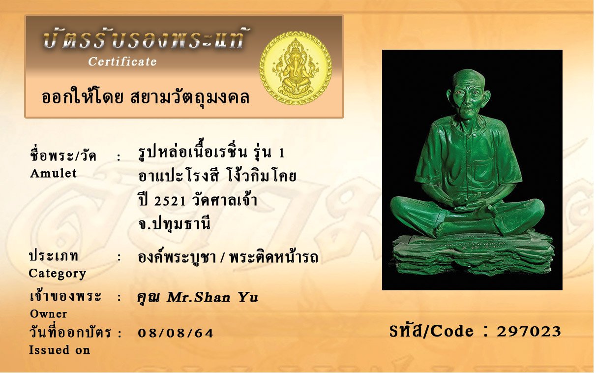 รหัสสินค้า : 297023 รูปหล่อเนื้อเรชิ่น รุ่น 1 อาแปะโรงสี โง้วกิมโคย ปี 2521 วัดศาลเจ้า จ.ปทุมธานี