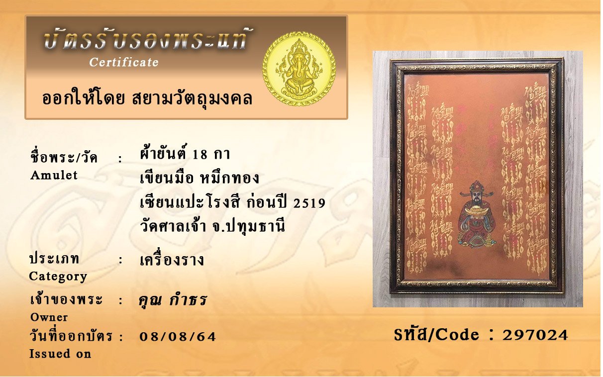 รหัสสินค้า : 297024 ผ้ายันต์ 18 กา เขียนมือ หมึกทอง เซียนแปะโรงสี ก่อนปี 2519 วัดศาลเจ้า จ.ปทุมธานี