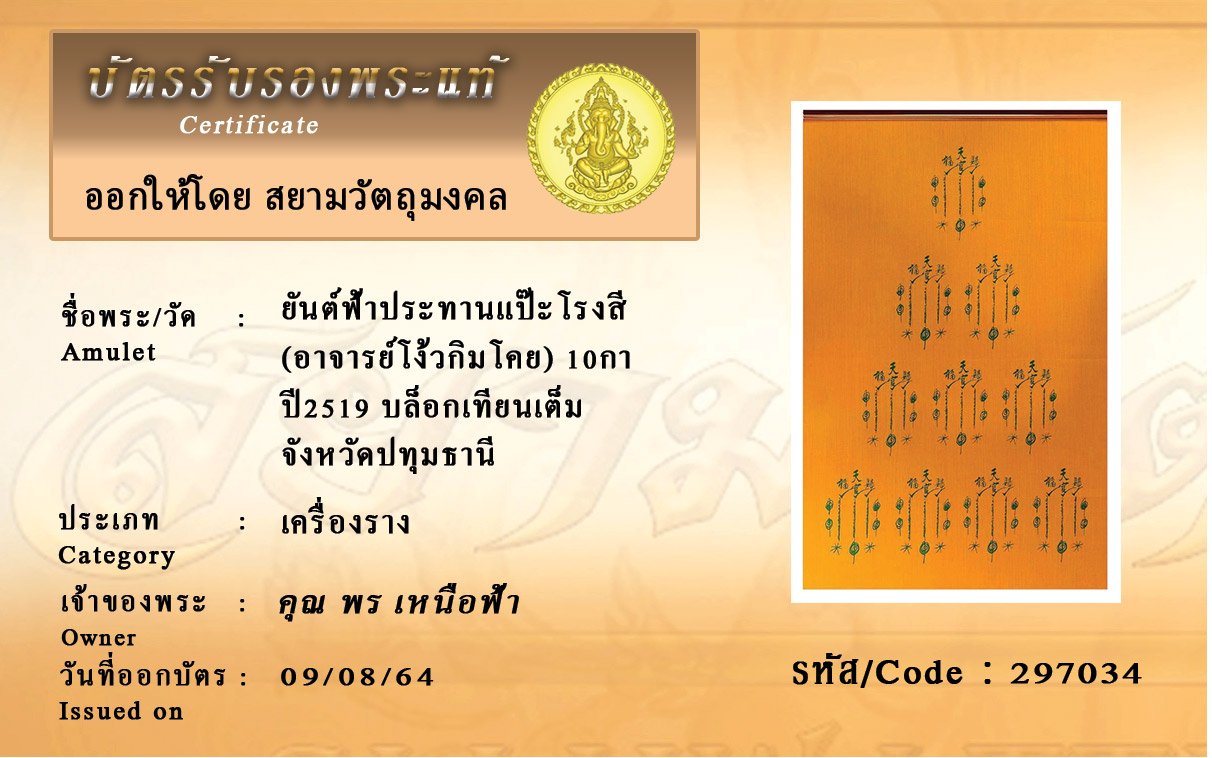 รหัสสินค้า : 297034 ยันต์ฟ้าประทานแป๊ะโรงสี (อาจารย์โง้วกิมโคย) 10กา ปี2519 บล็อกเทียนเต็ม จังหวัดปทุมธานี