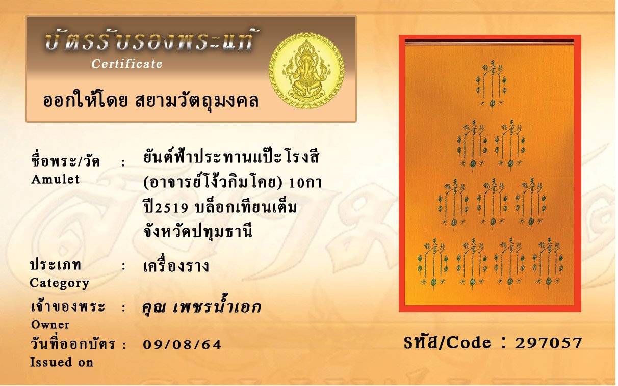 รหัสสินค้า : 297057 ยันต์ฟ้าประทานแป๊ะโรงสี (อาจารย์โง้วกิมโคย) 10กา ปี2519 บล็อกเทียนเต็ม จังหวัดปทุมธานี