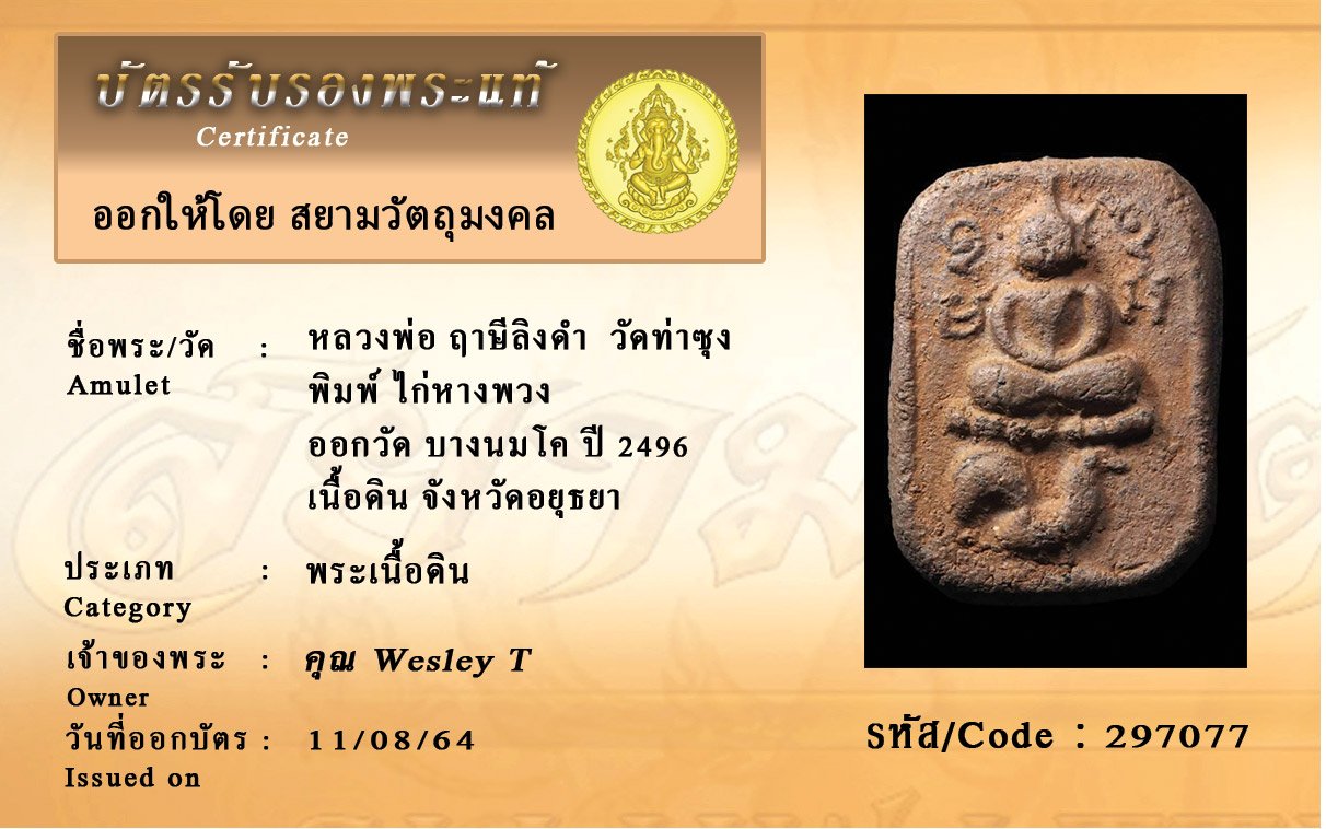 รหัสสินค้า : 297077 หลวงพ่อ ฤาษีลิงดำ วัดท่าซุง พิมพ์ ไก่หางพวง ออกวัด บางนมโค ปี 2496 เนื้อดิน จังหวัดอยุธยา