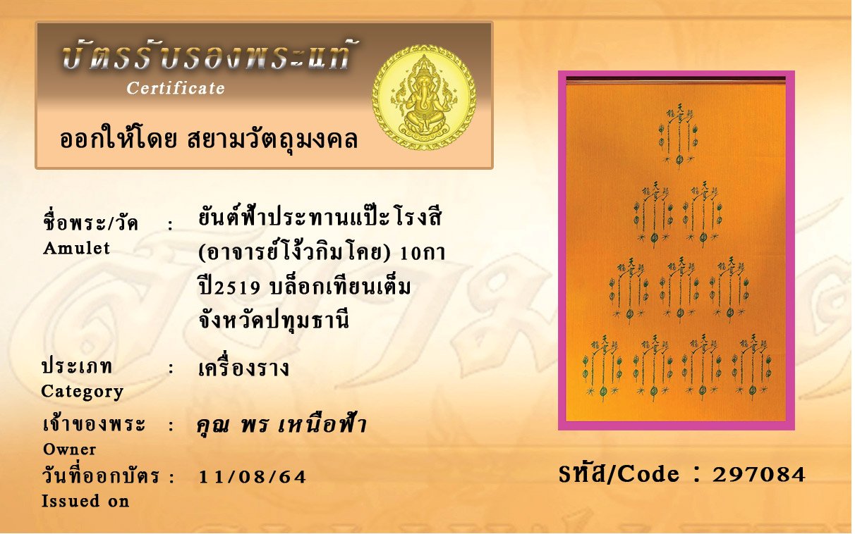 รหัสสินค้า : 297084 ยันต์ฟ้าประทานแป๊ะโรงสี (อาจารย์โง้วกิมโคย) 10กา ปี2519 บล็อกเทียนเต็ม จังหวัดปทุมธานี