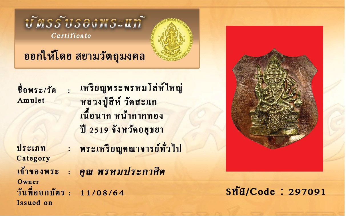 รหัสสินค้า : 297091 เหรียญพระพรหมโล่ห์ใหญ่ หลวงปู่สีห์ วัดสะแก เนื้อนาก หน้ากากทอง ปี 2519 จังหวัดอยุธยา