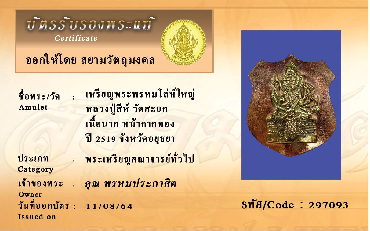 รหัสสินค้า : 297093 เหรียญพระพรหมโล่ห์ใหญ่ หลวงปู่สีห์ วัดสะแก เนื้อนาก หน้ากากทอง ปี 2519 จังหวัดอยุธยา