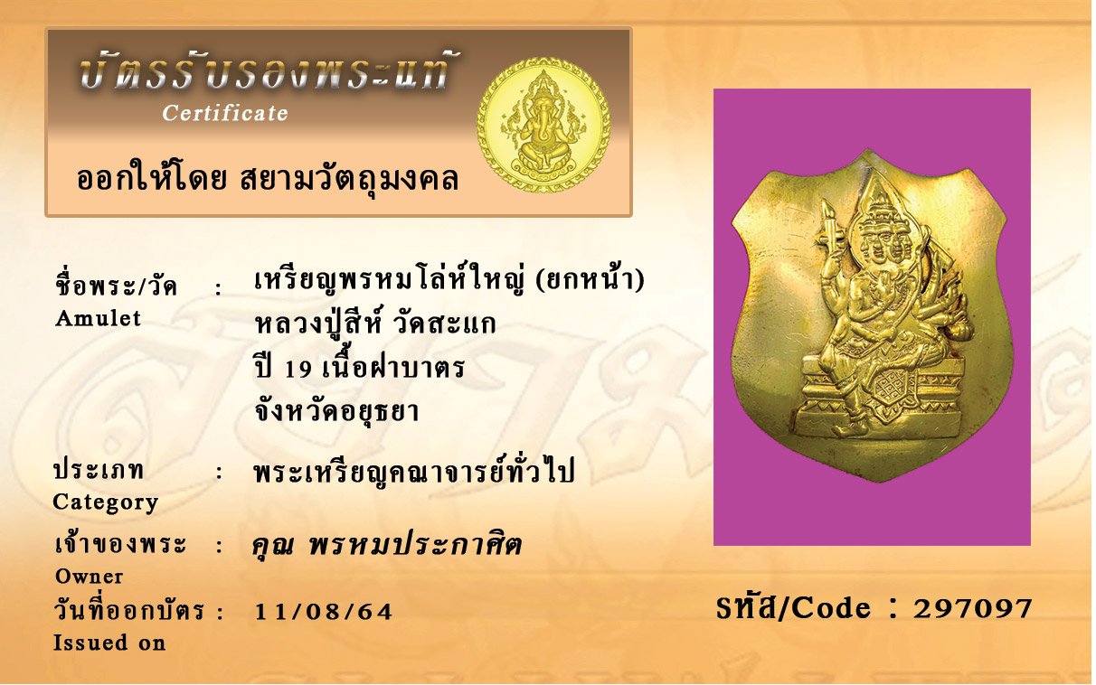 รหัสสินค้า : 297097 เหรียญพรหมโล่ห์ใหญ่ (ยกหน้า) หลวงปู่สีห์ วัดสะแก ปี 19 เนื้อฝาบาตร จังหวัดอยุธยา