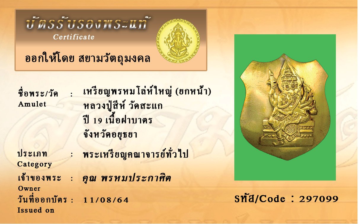 รหัสสินค้า : 297099 เหรียญพรหมโล่ห์ใหญ่ (ยกหน้า) หลวงปู่สีห์ วัดสะแก ปี 19 เนื้อฝาบาตร จังหวัดอยุธยา