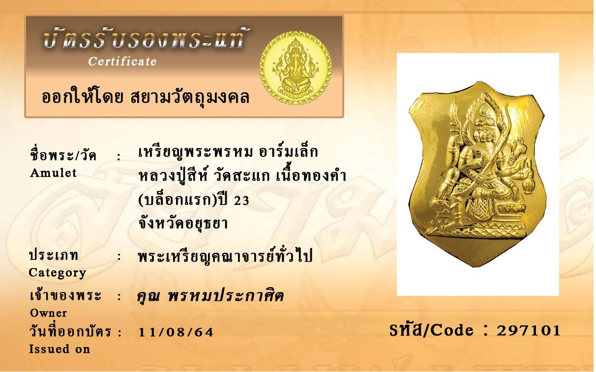 รหัสสินค้า : 297101 เหรียญพระพรหม อาร์มเล็ก หลวงปู่สีห์ วัดสะแกทองคำ (บล็อกแรก)ปี 23 จังหวัดอยุธยา