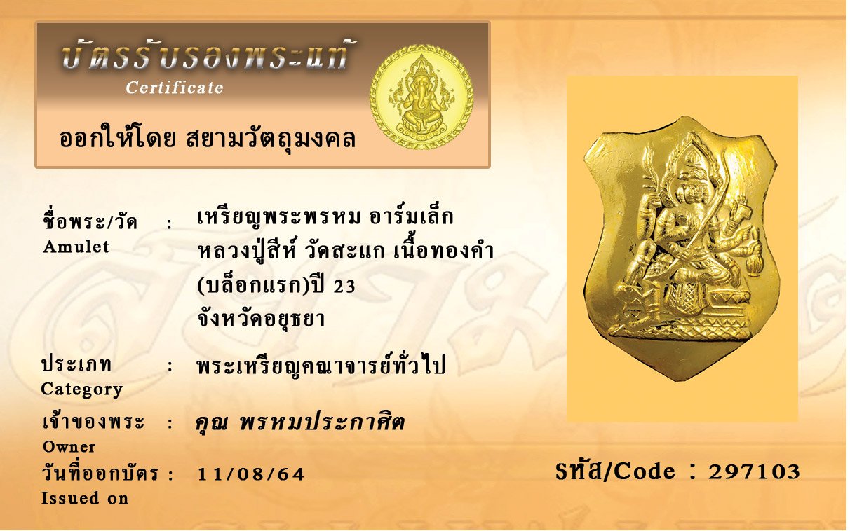 รหัสสินค้า : 297103 เหรียญพระพรหม อาร์มเล็ก หลวงปู่สีห์ วัดสะแกทองคำ (บล็อกแรก)ปี 23 จังหวัดอยุธยา