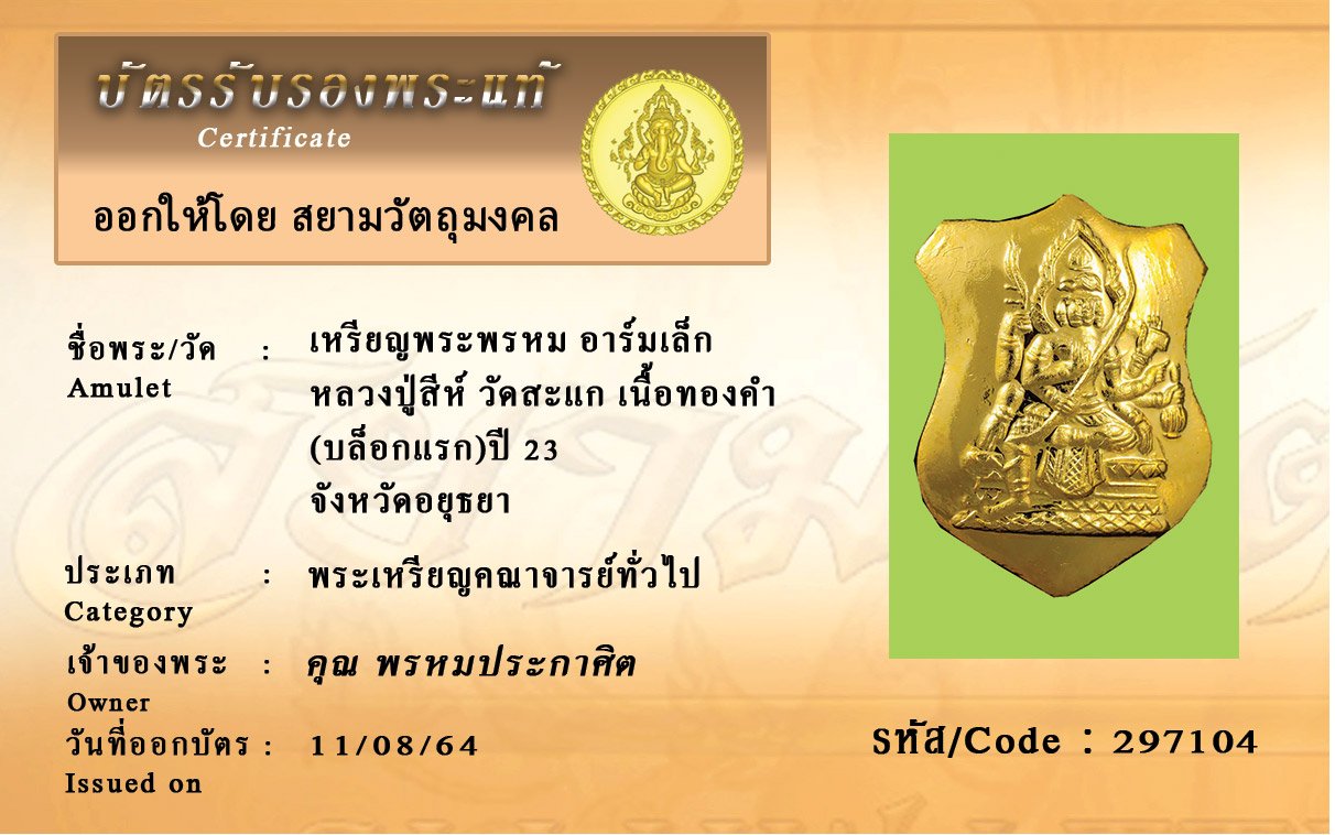 รหัสสินค้า : 297104 เหรียญพระพรหม อาร์มเล็ก หลวงปู่สีห์ วัดสะแกทองคำ (บล็อกแรก)ปี 23 จังหวัดอยุธยา