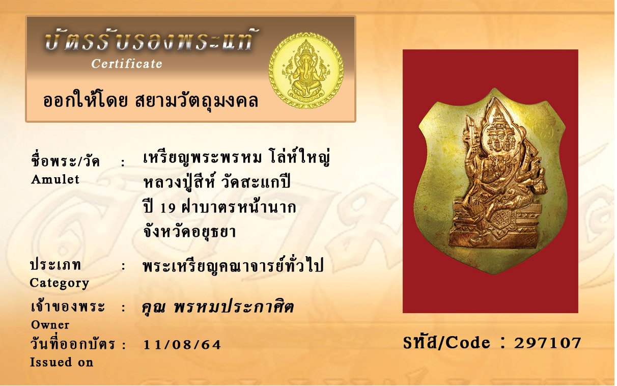 รหัสสินค้า : 297107 เหรียญพระพรหม โล่ห์ใหญ่ หลวงปู่สีห์ วัดสะแกปี ปี 19 ฝาบาตรหน้านาก จังหวัดอยุธยา