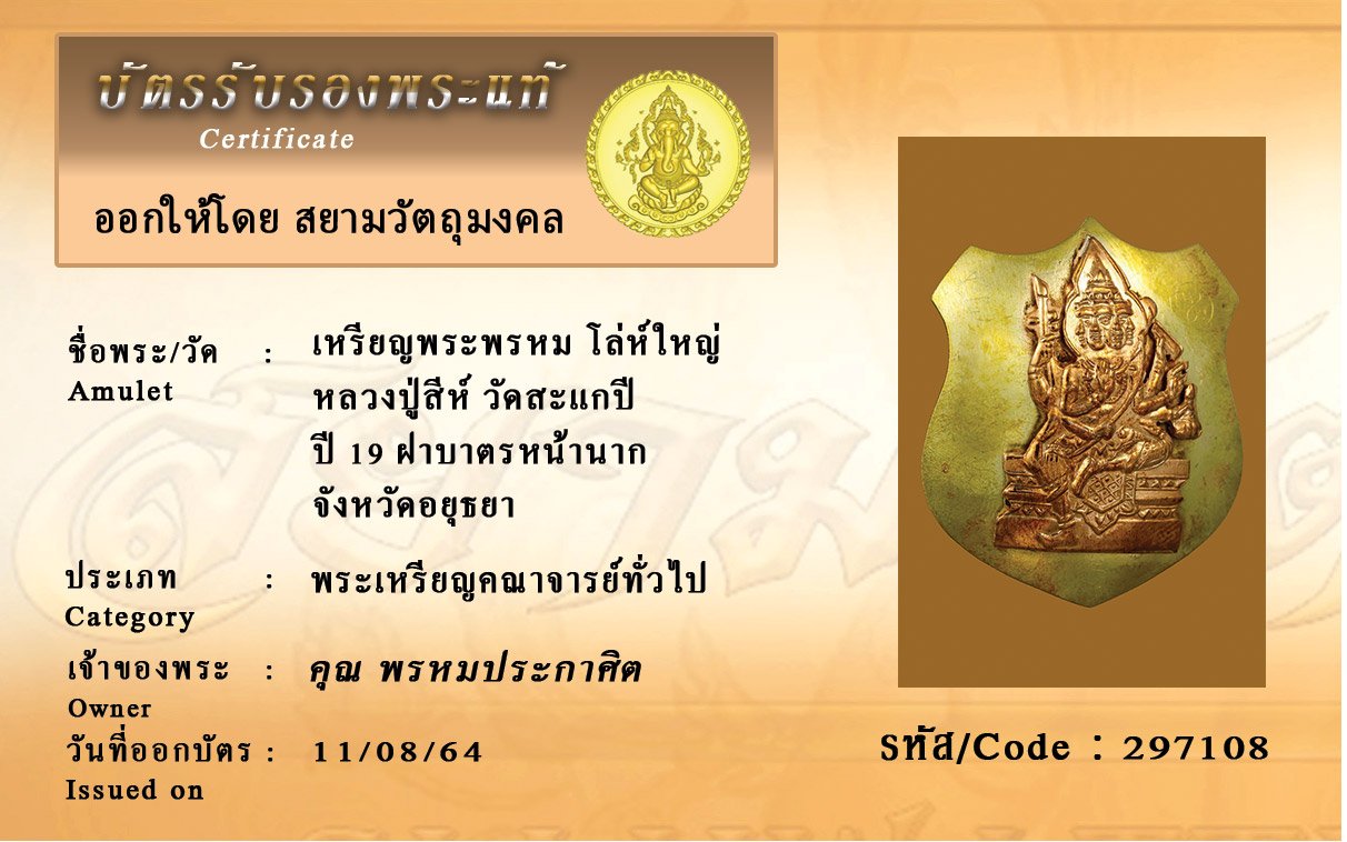รหัสสินค้า : 297108 เหรียญพระพรหม โล่ห์ใหญ่ หลวงปู่สีห์ วัดสะแกปี ปี 19 ฝาบาตรหน้านาก จังหวัดอยุธยา