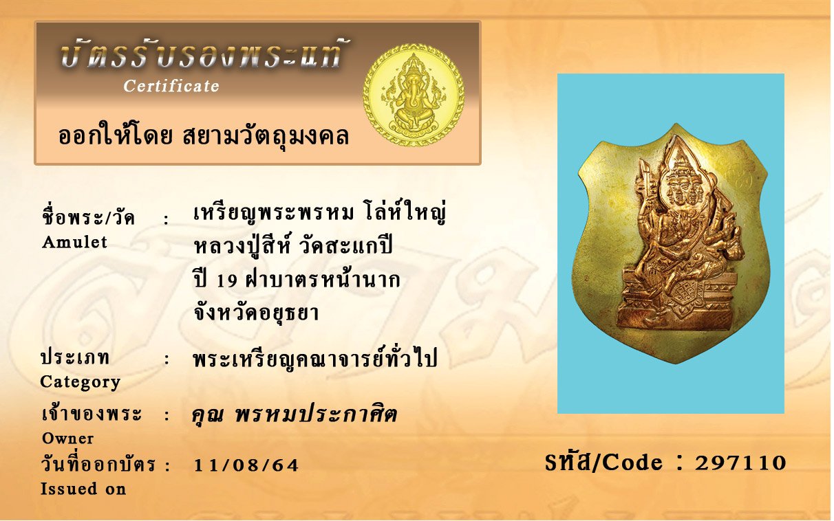 รหัสสินค้า : 297110 เหรียญพระพรหม โล่ห์ใหญ่ หลวงปู่สีห์ วัดสะแกปี ปี 19 ฝาบาตรหน้านาก จังหวัดอยุธยา