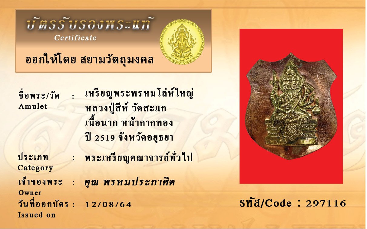 รหัสสินค้า : 297116 เหรียญพระพรหมโล่ห์ใหญ่ หลวงปู่สีห์ วัดสะแก เนื้อนาก หน้ากากทอง ปี 2519 จังหวัดอยุธยา