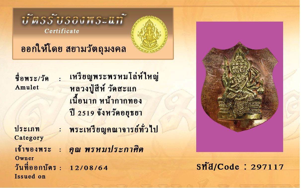 รหัสสินค้า : 297117 เหรียญพระพรหมโล่ห์ใหญ่ หลวงปู่สีห์ วัดสะแก เนื้อนาก หน้ากากทอง ปี 2519 จังหวัดอยุธยา