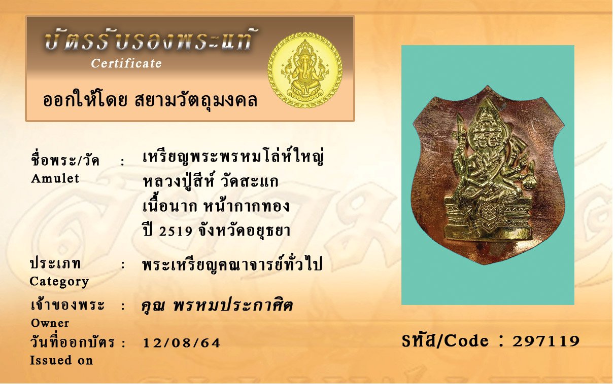 รหัสสินค้า : 297119 เหรียญพระพรหมโล่ห์ใหญ่ หลวงปู่สีห์ วัดสะแก เนื้อนาก หน้ากากทอง ปี 2519 จังหวัดอยุธยา