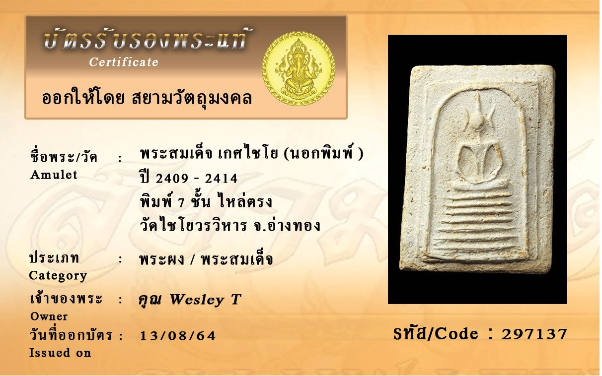 รหัสสินค้า : 297137 พระสมเด็จ เกศไชโย (นอกพิมพ์ ) ปี 2409 - 2414 พิมพ์ 7 ชั้น ไหล่ตรง วัดไชโยวรวิหาร จ.อ่างทอง