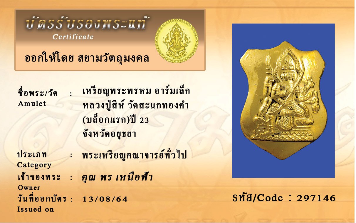 รหัสสินค้า : 297146 เหรียญพระพรหม อาร์มเล็ก หลวงปู่สีห์ วัดสะแกทองคำ (บล็อกแรก)ปี 23 จังหวัดอยุธยา