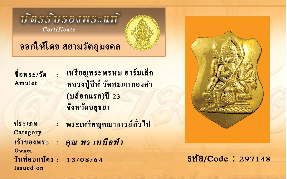 รหัสสินค้า : 297148 เหรียญพระพรหม อาร์มเล็ก หลวงปู่สีห์ วัดสะแกทองคำ (บล็อกแรก)ปี 23 จังหวัดอยุธยา