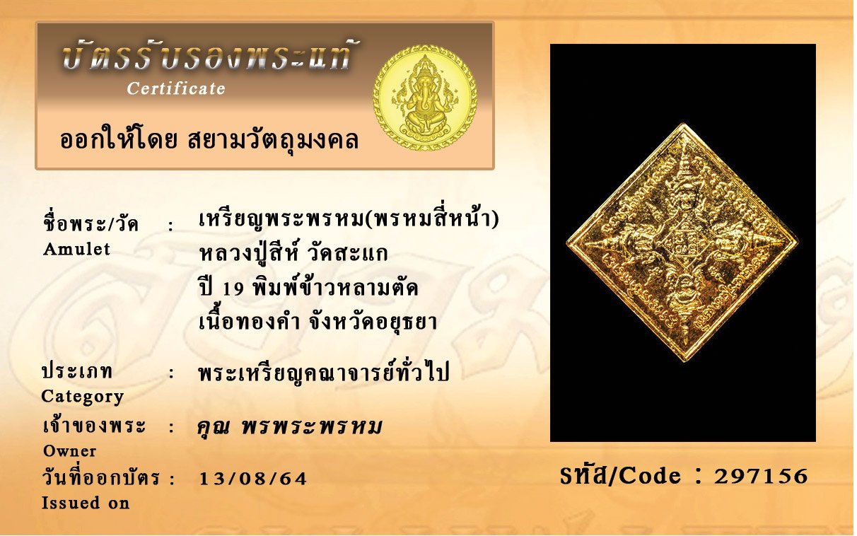 รหัสสินค้า : 297156 เหรียญพระพรหม(พรหมสี่หน้า) หลวงปู่สีห์ วัดสะแก ปี 19 พิมพ์ข้าวหลามตัด เนื้อทองคำ จังหวัดอยุธยา