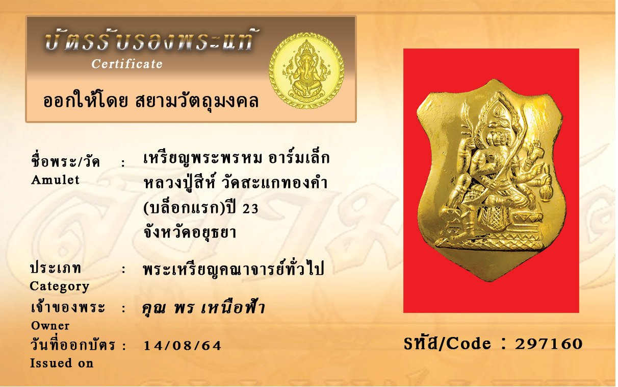 รหัสสินค้า : 297160 เหรียญพระพรหม อาร์มเล็ก หลวงปู่สีห์ วัดสะแกทองคำ (บล็อกแรก)ปี 23 จังหวัดอยุธยา