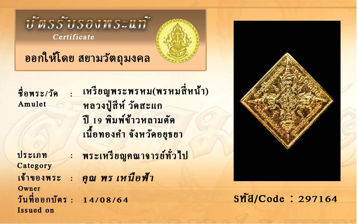 รหัสสินค้า : 297164 เหรียญพระพรหม(พรหมสี่หน้า) หลวงปู่สีห์ วัดสะแก ปี 19 พิมพ์ข้าวหลามตัด เนื้อทองคำ จังหวัดอยุธยา
