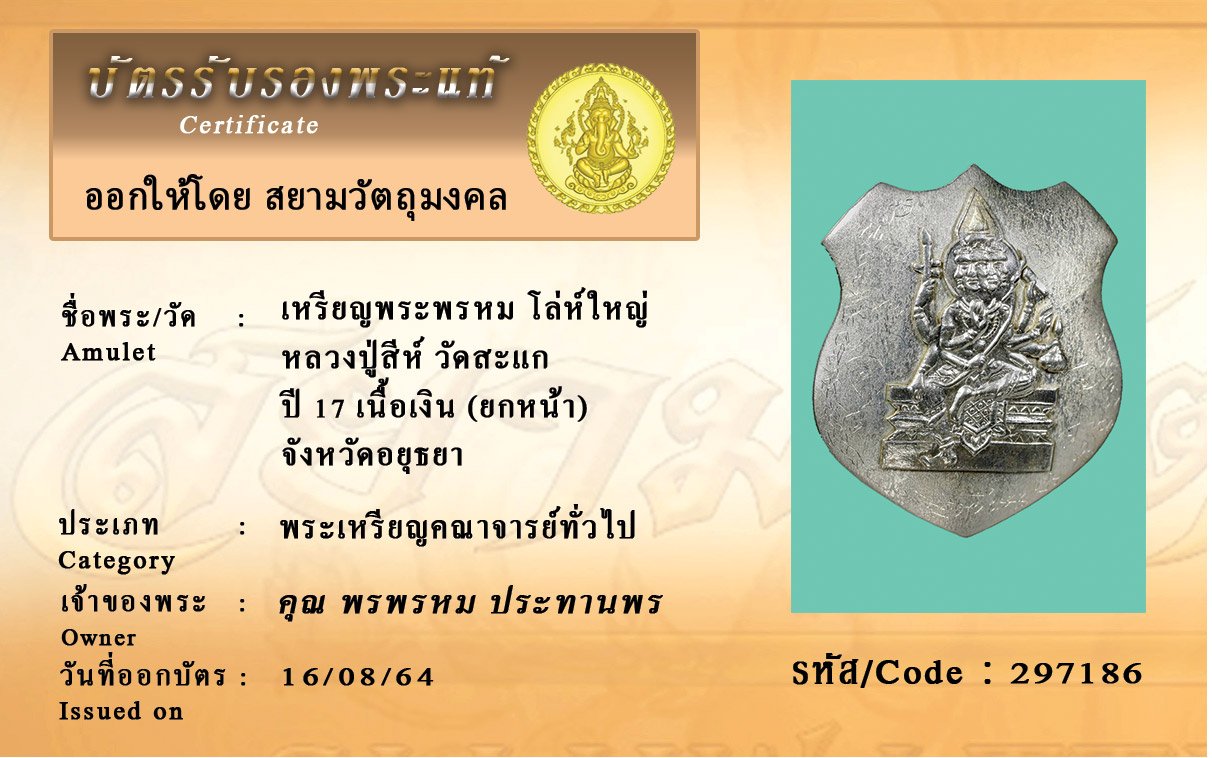 รหัสสินค้า : 297186 เหรียญพระพรหม โล่ห์ใหญ่ หลวงปู่สีห์ วัดสะแก ปี 17 เนื้อเงิน (ยกหน้า) จังหวัดอยุธยา