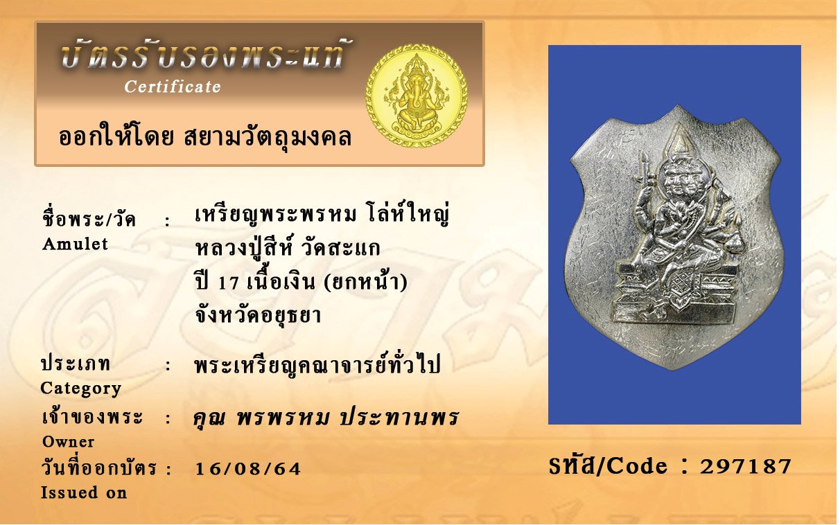รหัสสินค้า : 297187 เหรียญพระพรหม โล่ห์ใหญ่ หลวงปู่สีห์ วัดสะแก ปี 17 เนื้อเงิน (ยกหน้า) จังหวัดอยุธยา