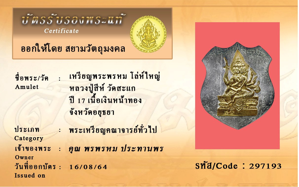 รหัสสินค้า : 297193 เหรียญพระพรหม โล่ห์ใหญ่ หลวงปู่สีห์ วัดสะแก ปี 17 เนื้อเงินหน้าทอง จังหวัดอยุธยา