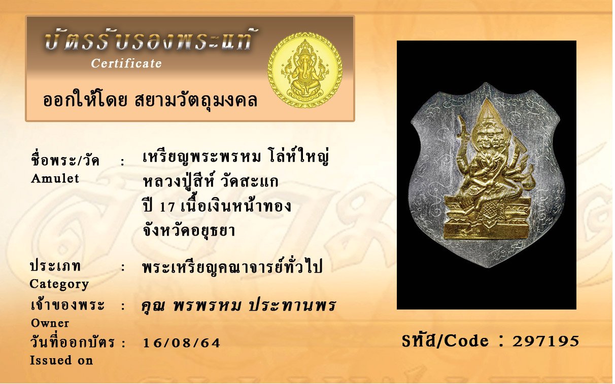 รหัสสินค้า : 297195 เหรียญพระพรหม โล่ห์ใหญ่ หลวงปู่สีห์ วัดสะแก ปี 17 เนื้อเงินหน้าทอง จังหวัดอยุธยา