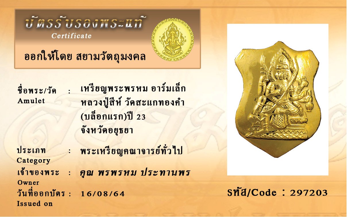 รหัสสินค้า : 297203 เหรียญพระพรหม อาร์มเล็ก หลวงปู่สีห์ วัดสะแกทองคำ (บล็อกแรก)ปี 23 จังหวัดอยุธยา