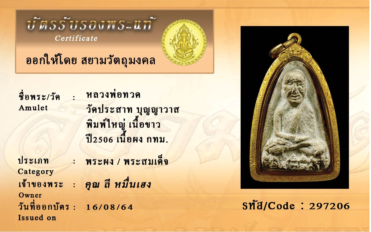 รหัสสินค้า : 297206 หลวงพ่อทวด วัดประสาท บุญญาวาส พิมพ์ใหญ่ เนื้อขาว ปี2506 เนื้อผง กทม.