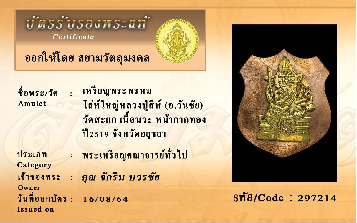รหัสสินค้า : 297214 เหรียญพระพรหม โล่ห์ใหญ่หลวงปู่สีห์ (อ.วันชัย) วัดสะแก เนื้อนวะ หน้ากากทอง ปี2519 จังหวัดอยุธยา