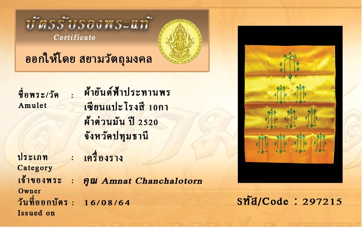 รหัสสินค้า : 297215 ผ้ายันต์ฟ้าประทานพร เซียนแปะโรงสี 10กา ผ้าต่วนมัน ปี 2520 จังหวัดปทุมธานี