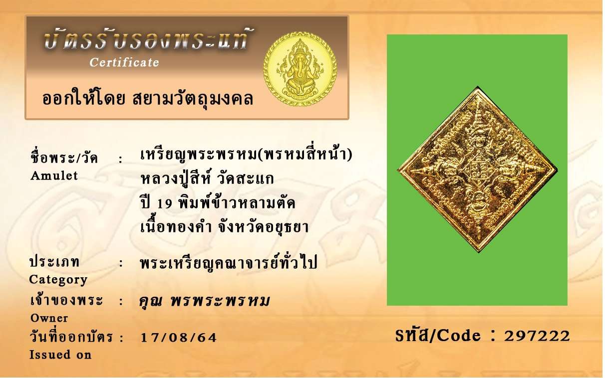 รหัสสินค้า : 297222 เหรียญพระพรหม(พรหมสี่หน้า) หลวงปู่สีห์ วัดสะแก ปี 19 พิมพ์ข้าวหลามตัด เนื้อทองคำ จังหวัดอยุธยา