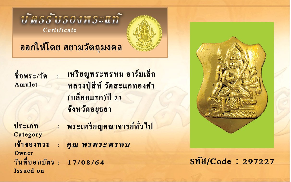 รหัสสินค้า : 297227 เหรียญพระพรหม อาร์มเล็ก หลวงปู่สีห์ วัดสะแกทองคำ (บล็อกแรก)ปี 23 จังหวัดอยุธยา
